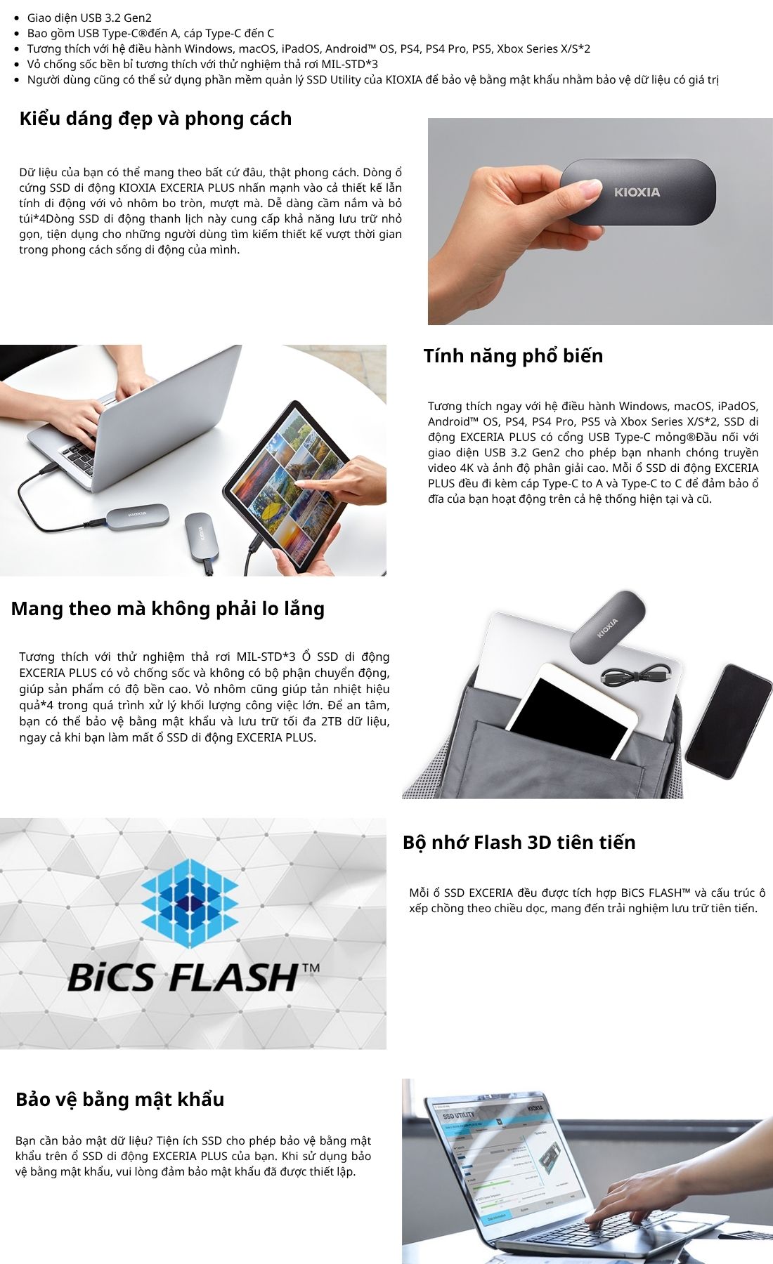 Tương thích hệ điều hành: Windows, MacOS, Linux,… - Có thể định dạng lại khi sử dụng trên các hệ điều hành khác.