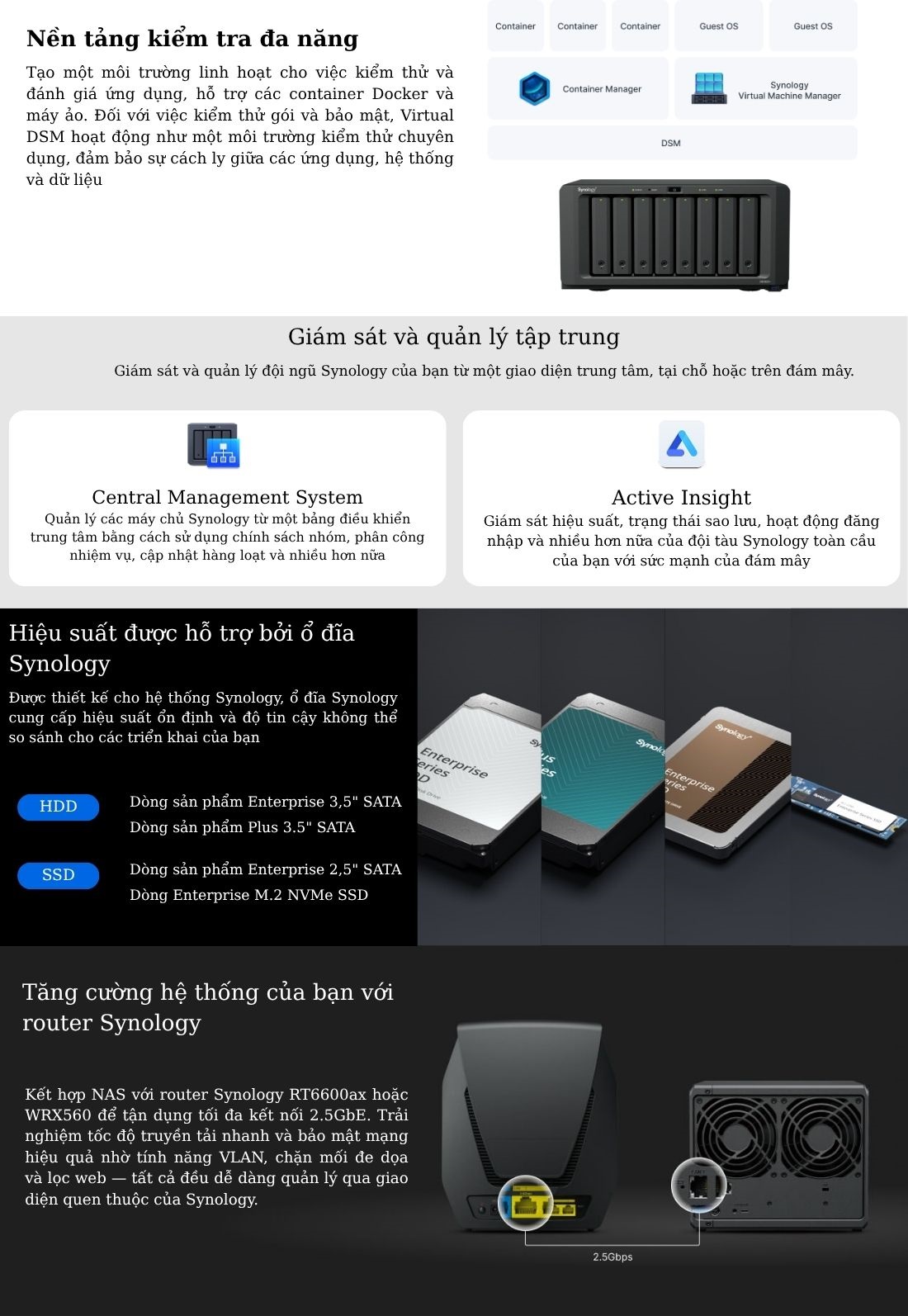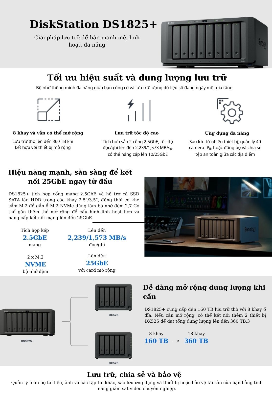 Ổ cứng mạng Synology DS1825+ 8 bay: Bộ xử lý CPU AMD Ryzen V1500B 64-bit Quad Core 2.2 GHz, Ram 8 GB DDR4 ECC SODIMM, x2 LAN RJ-45 2.5 GbE, x3 Cổng USB 3.2 gen 1, 1 x Gen3 x8 slot (x4 link). Quản lý lưu trữ dung lượng lớn tốc độ vượt trội, phục vụ công việc đặc thù chuyên nghiệp.